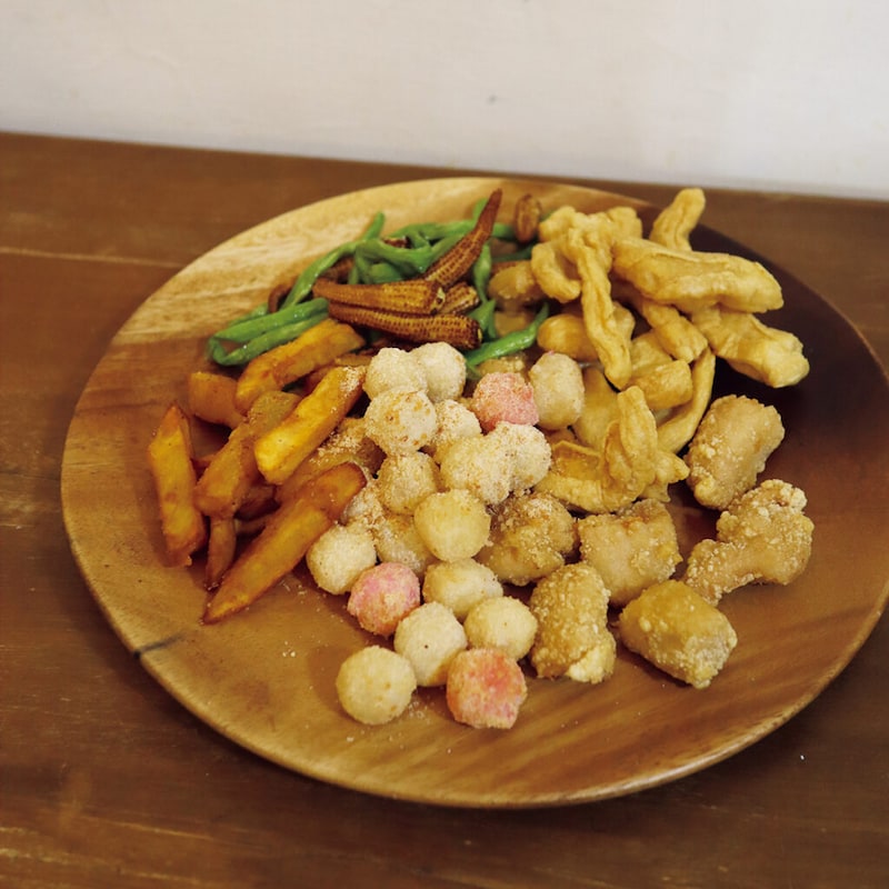 夜市や飲食店の多い通りで見かける、台湾からあげ「鹹酥雞」。鶏肉や野菜などの材料にサツマイモの粉などで作ったからあげ粉をまぶして揚げたもので、主に夜食として幅広い世代に親しまれている。我が家も夜に映画を観るとなると、台湾人の夫が嬉々として買いに出かける。通って10年になるこちらの店は、「甜不辣」というさつま揚げが人気。油っぽさがなく、サクッと軽やかに揚がっているので、冷めてもおいしい。店頭で好きな具材を選んでお会計を済ませると、お店のスタッフが手際よく揚げてくれる仕組み。写真右上から時計回りに甜不辣、骨なし鶏のから揚げ、湯圓、サツマイモ、いんげん、ヤングコーン。こんなにたっぷりでも245元、お財布にも優しい小吃だ。