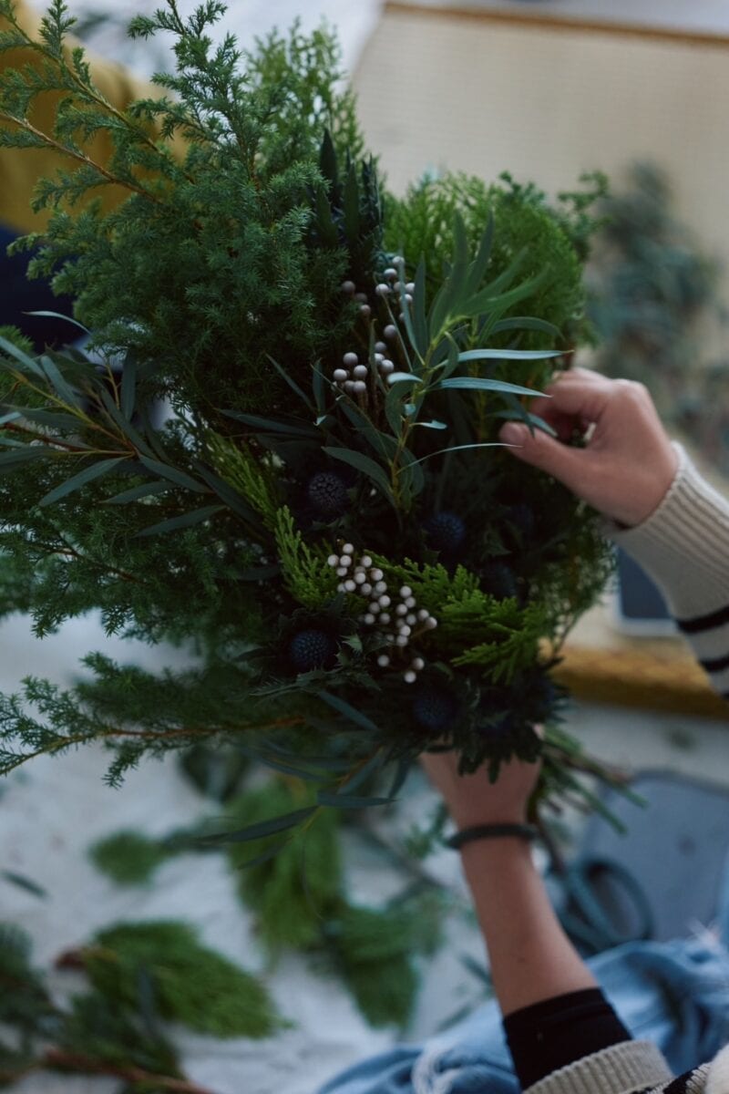 クリスマスや年末が近づくと、リースやスワッグのワークショップをする機会が増えます。私はスワッグを作るのが好きです。年末だけに限らず1年中、季節の植物を束ねるスワッグのワークショップをしているのですが、束ねてすぐのフレッシュな植物が、だんだんとドライになっていく様子を眺めるのが好きで、そのときだけの植物の色や形、香りを長く楽しめるのは、スワッグならでは。