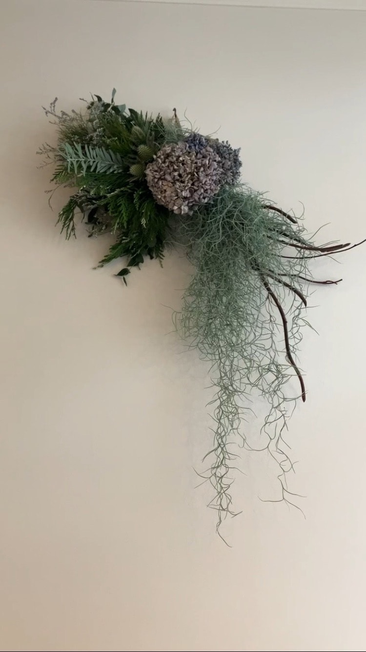 壁にかけて飾るスワッグ。ブーケのように丸く束ねるのではなく、植物を積み重ねていくように束ねます。とはいえ、細かいことをあまり気にしなくてもいい感じにまとまるのがスワッグのいいところ。