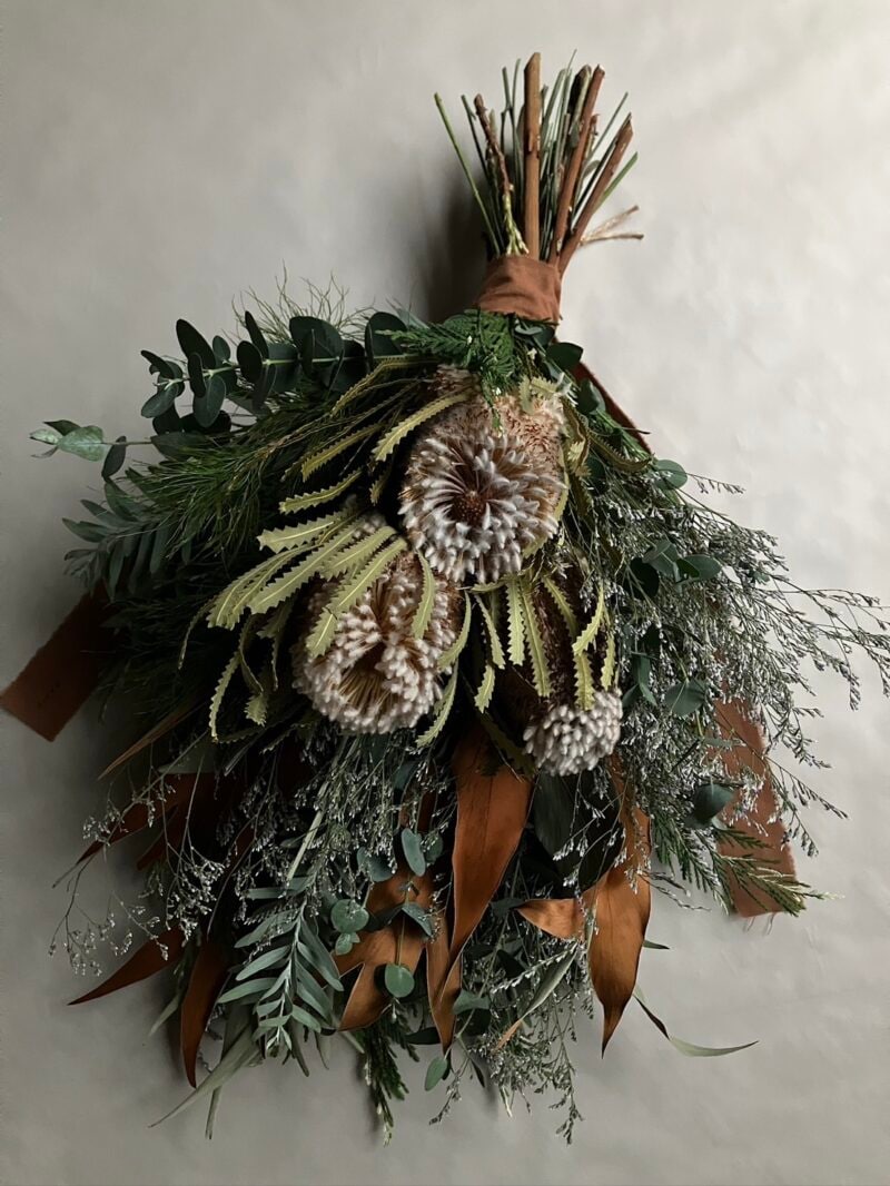 冬の野原をイメージして、緑と茶の2色をメインにまとめたウィンタースワッグを作りました。ユーカリや紫色の小さな花をつけるリモニューム、茶色の葉が特徴のグレビレア ゴールド、乾燥に強い南半球の植物・バンクシアを添えました。華やかさがほしいときは、赤い実ものやケイトウなど、明るい色の植物を取り入れてください。