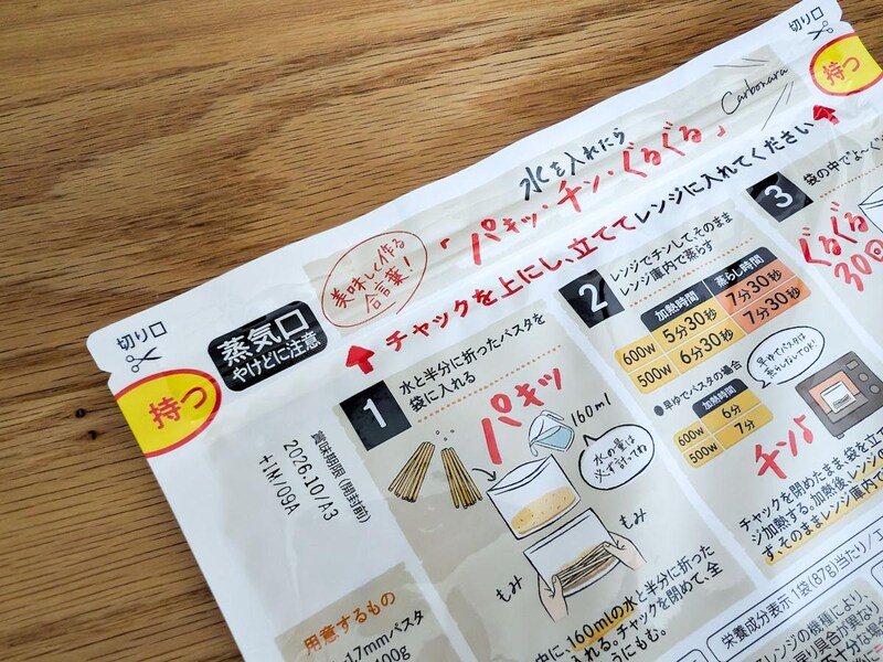 パッケージが自立するので、気力ゼロの日はこのまま食べても◎大きな鍋も大量の水も、菜箸も必要ありません。パスタと少量の水を用意すれば、すべてパッケージの中で完結し、電子レンジに入れたらそのあとは既定の時間までほったらかしでOKなのです。