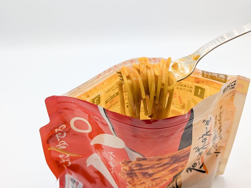 30回混ぜるとソースとパスタに一体感がでます加熱と蒸らしが終わった後、最初に開けるとソースとパスタと分かれているのですが、作り方の通り袋の中で30回混ぜると、トロっと乳化してパスタ1本1本にしっかりソースが絡みます。