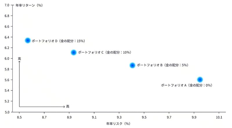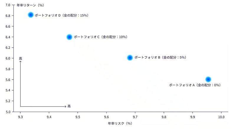 ポートフォリオ全体がボラティリティ(価格の上下への変動)によってさらされる年率リスクは金の比率が0%で9.95%、5%で9.68%、10%で9.47%、15%で9.33%と10%まで割り当てを増やすなかで、ポートフォリオのリスクが低減する傾向がみられます。
