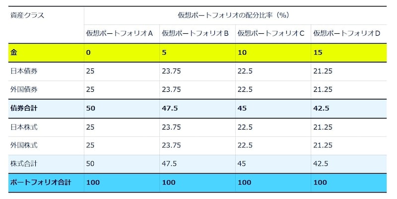 金を除いた基本の仮想ポートフォリオとして、国内債券、外国債券、国内株式、外国株式にそれぞれ25%ずつ配分(ポートフォリオA)。そこから金を5%(ポートフォリオB)、10%(ポートフォリオC)、15%(ポートフォリオD)と加え、各資産の割り当てを均等に減らしたケースを検証しました。