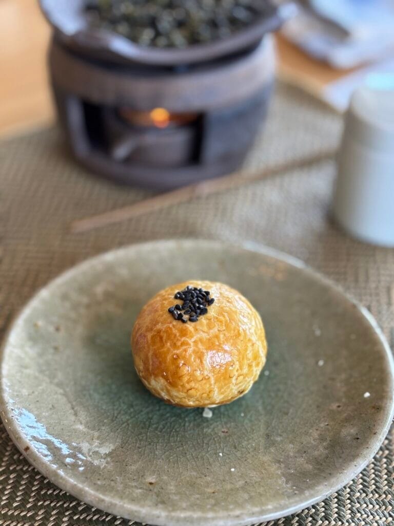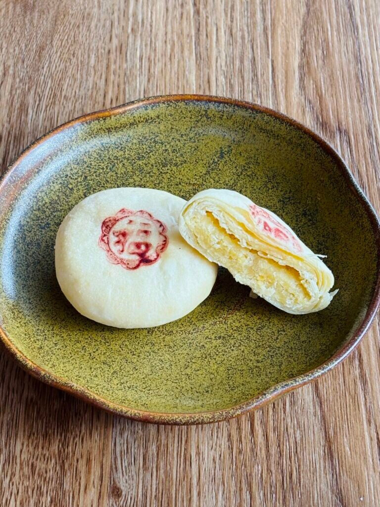 この烏龍茶に合わせたのは、緑豆椪(リュウトウポン)。緑豆餡を包んだパイ饅頭で、繊細な生地の層がほどけるように口の中で広がります。控えめな甘さと豆の香ばしさが、高山茶の澄んだ香りをより引き立ててくれます。