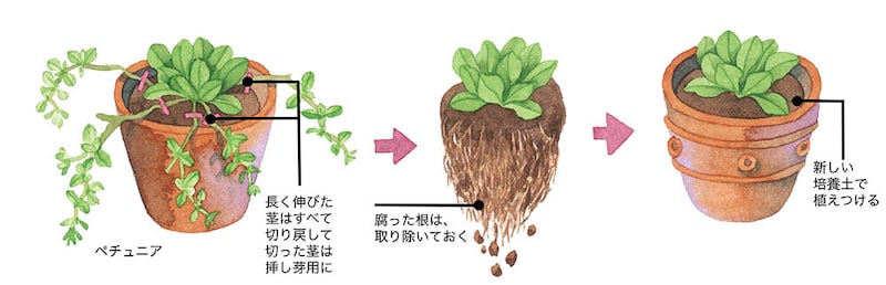 春から夏に人気のペチュニアやバーベナなど、栄養系タイプの草花は、秋のうちに植え替えておくと、翌年の株張りに大きく差が出ます。整理して切り戻した茎は、挿し芽をしておくと、簡単に根づいて株を増やせます。
