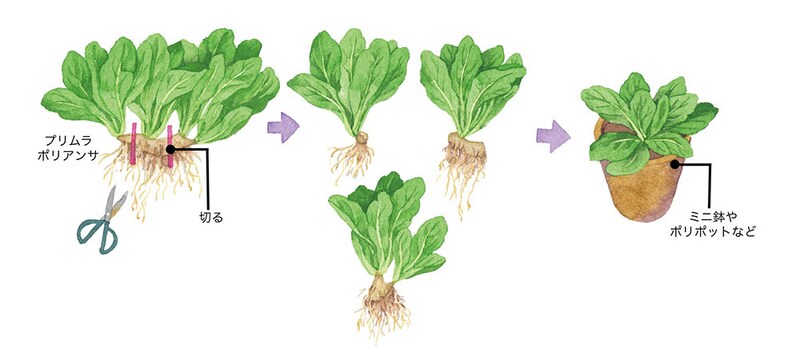 花が終わって夏越しが成功した多年草は、地際から株が広がり、株分けできるほど生育しています。このままでは窮屈なので、株分けしましょう。あまり細かく分けすぎないのがポイントです。