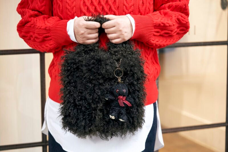 ラムのファーバッグは、森さんが中高生だったころにヴィンテージショップで買ったもの。「ヴィンテージが好きで、長く使っています」(森さん)。ベアーのチャームをつけて大人可愛く。