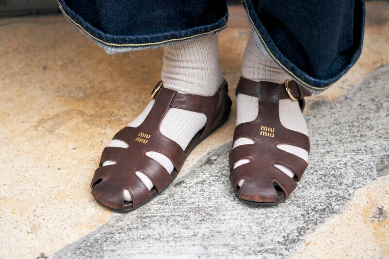 ミュウミュウのフィッシャーマンズサンダルをベージュのソックスに合わせると、重くなりがちな冬のコーデに、こなれ感が出ます。