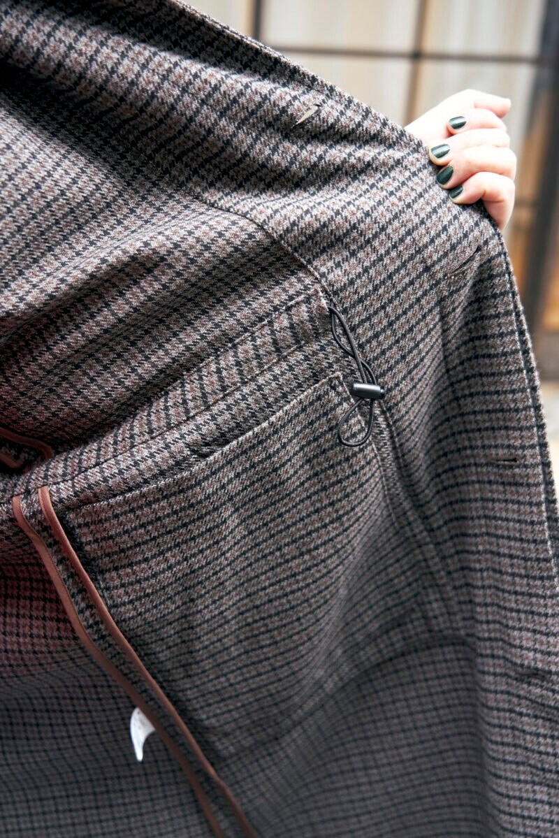 「このパイピングが骨組みになって、ご家庭で洗濯しても型くずれしないようになっています。また、調節ひもで絞ってタイトにも着られます」と森さん。