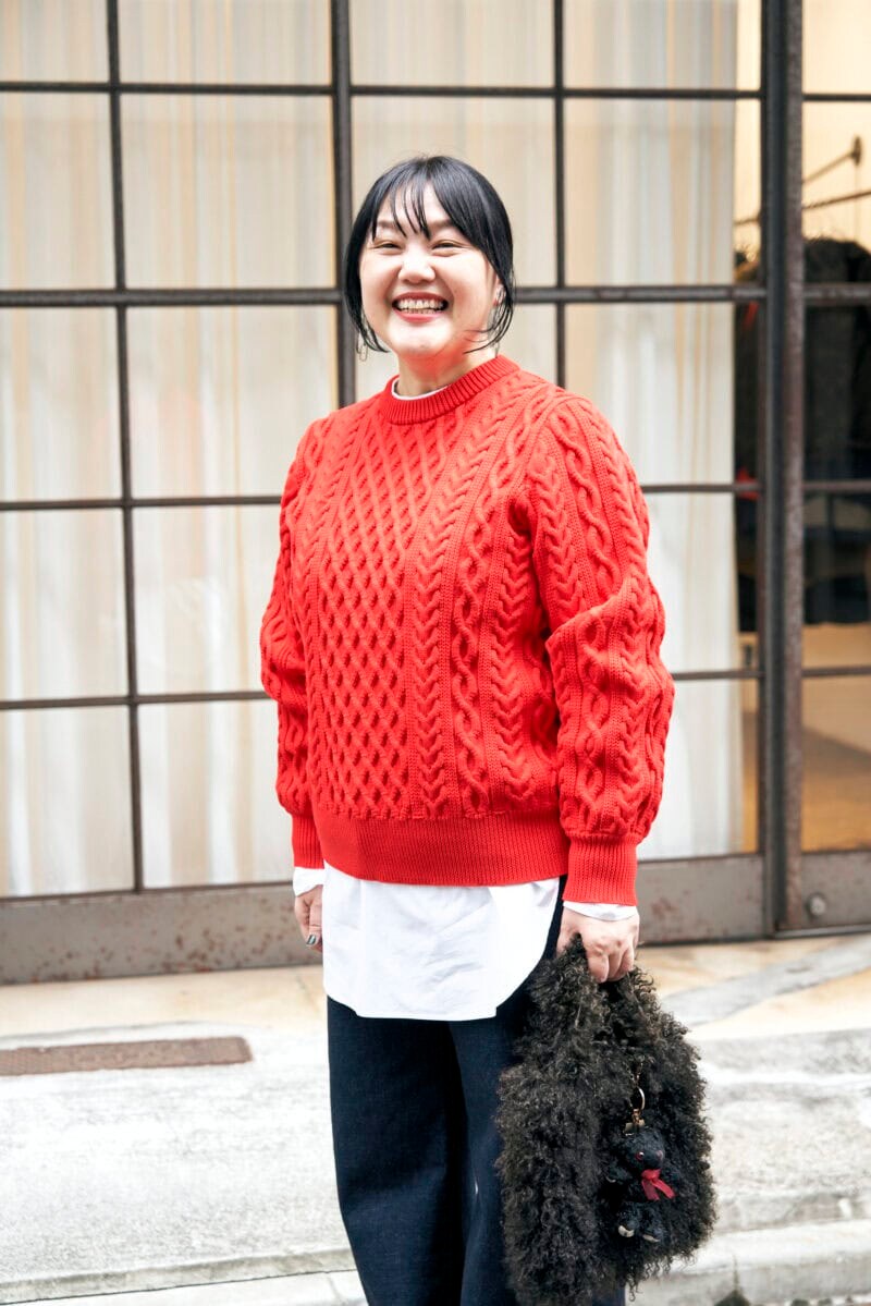 発色のきれいなアラン編みのセーターは軽くて速乾性があります。「インにした白シャツは、後ろにファスナーが付いたチュニックタイプで、裾を見せると抜け感が出ます」(森さん)。ワンウォッシュしたデニムパンツを合わせると、ハッピーな気持ちになります。