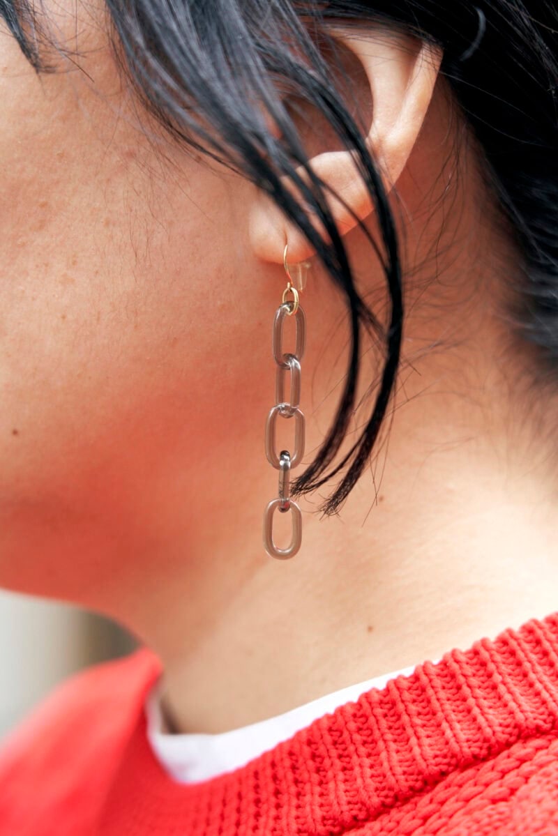 クルーネックのセーター×デニムパンツの着こなしには、シャープなピアスが似合います。甘すぎないデザインがおしゃれです。