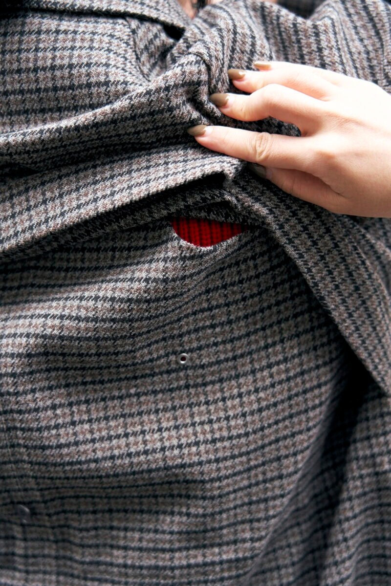 トレンドのブラウンチェックのコートは、一見ウール素材に見えて実はポリエステル100%。「おうちで洗濯できる素材で、型くずれしないように工夫してあります」と森さん。このコートを主役に、白シャツと赤セーターをレイヤード。ワンウォッシュのデニムを合わせて、大人のキュートさをプラスしました。「水曜日はオフィスワークに加えてお店に立つ日。ハッピーな感じでお客さまを迎えられるようなコーデにしました」(森さん)