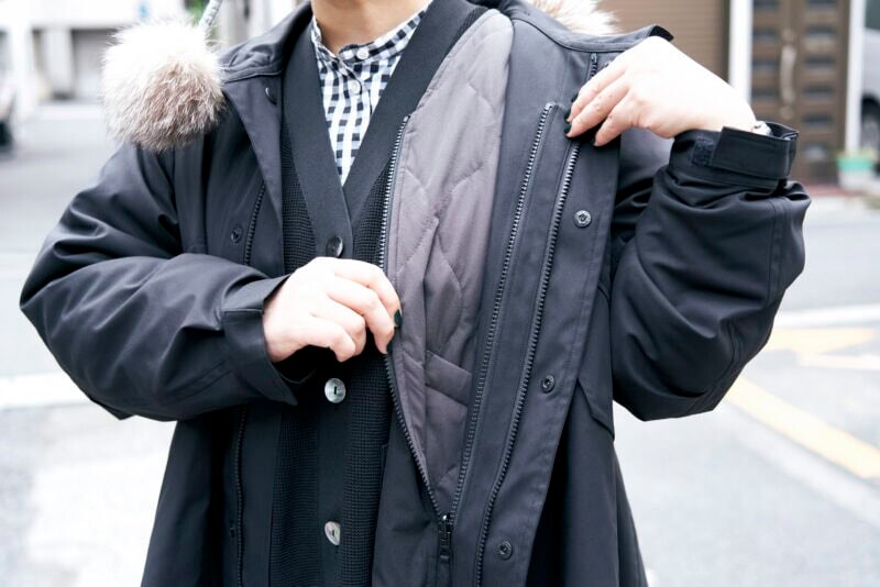 気温が10℃前後の冬日には、ライナーのブルゾンをセットして、15℃ぐらいまで上がったらライナーを外しても着られます。「このライナーはリバーシブル。単独でブルゾンとしても着られるので、旅行先でも便利です」と森さん。
