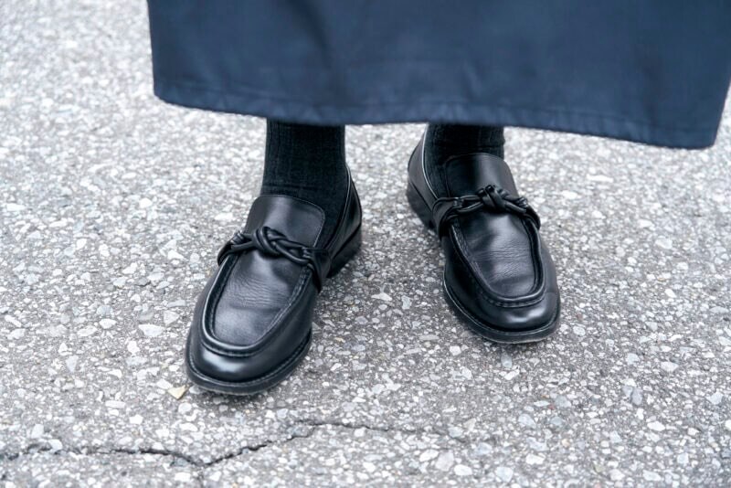 モノトーンのきれいめスタイルには、レザーローファーを合わせます。「ボッテガ・ヴェネタのローファーは、どんなスタイルにも合わせやすくて、モード感がプラスされます」(森さん)
