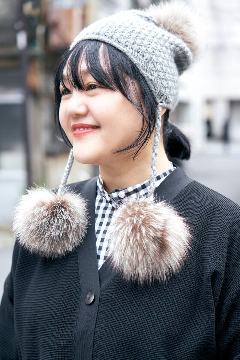 モッズコートを大人可愛く見せるのが、ファーのポンポンが付いたカシミア帽子。冬のモノトーンコーデに、遊び心とキュートさをプラスします。