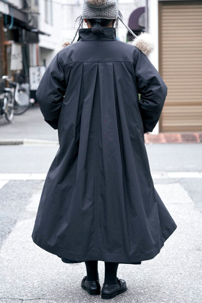 モッズコートでありながら後ろにタックがあるデザインは、フェミニンなシルエットに。インにニットを着ても着膨れせずにすっきりと見えます。