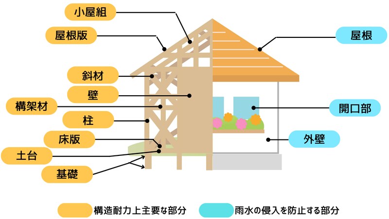 これは、引き渡しから一定期間内に構造耐力上主要な部分や雨水の浸入を防止する部分(※下図参照)に欠陥が見つかったときに、補修にかかった費用が保証される制度です。保証が受けられれば、修理費用を負担しなくて済みます。
