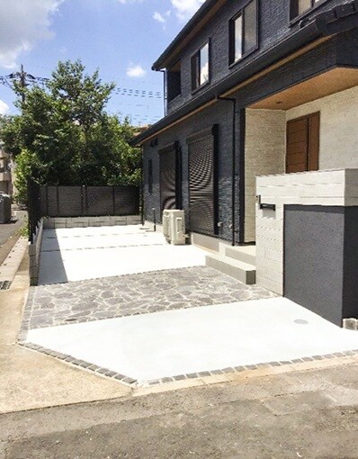 駐車場とアプローチ部分にコンクリートとモザイクタイルでの舗装を施し、見た目に変化を付けるデザインに仕上げています。