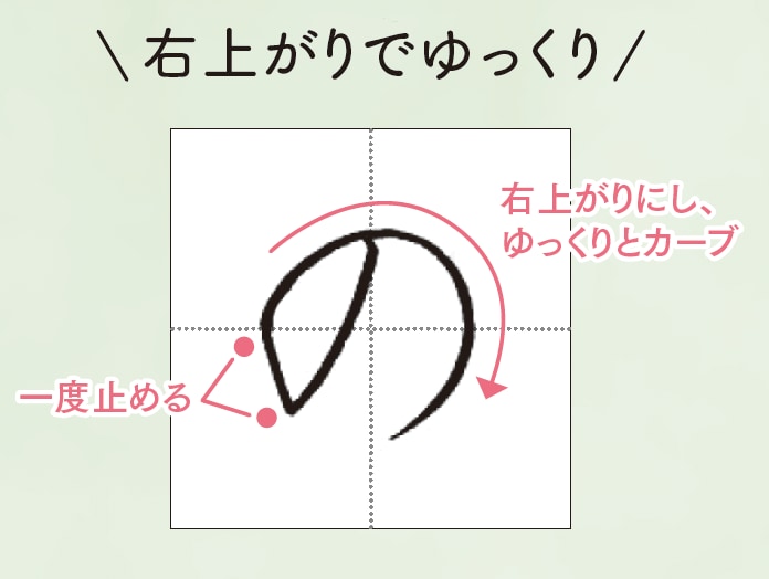 「の」「め」など、右曲がりの大曲線をもつひらがなは、文字全体にカーブをつけると、丸くて幼い文字になってしまいます。