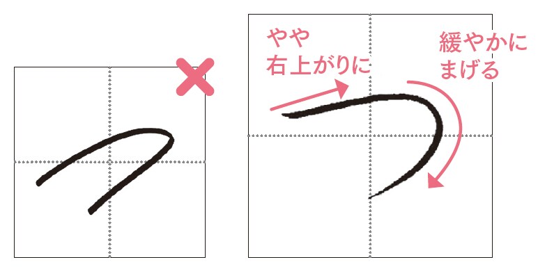 「の」「め」など、右曲がりの大曲線をもつひらがなは、文字全体にカーブをつけると、丸くて幼い文字になってしまいます。
