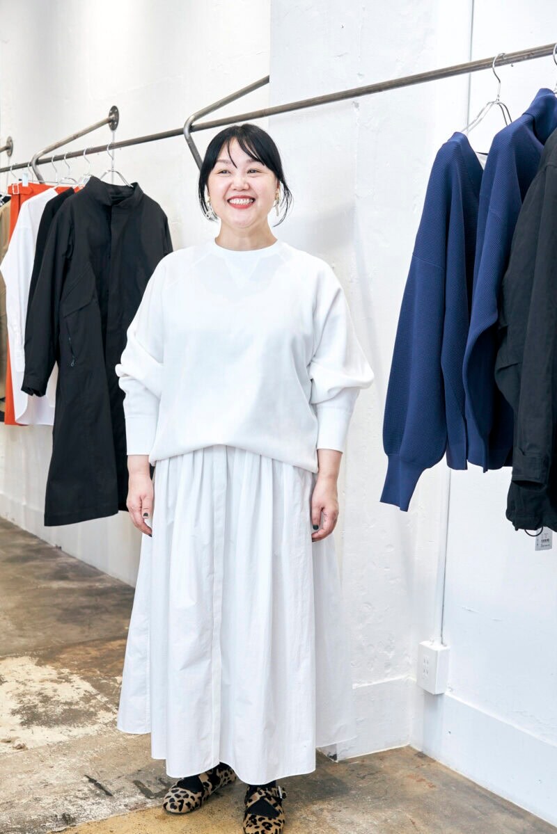 ゆったりとしたシルエットの白ニットは、軽くて速乾性があります。「スウェット感覚で着られて、お家でも洗濯できます。スカートもポリエステルで軽くて落ち感があります」と森さん。落ちついた色を選びがちな冬にこそ、白が映えます。