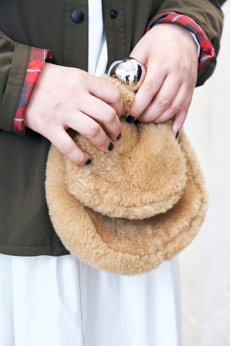 ころんと可愛らしいフォルムのファーバッグはジルサンダーのもの。「たくさん入りませんが、持っているだけ気分が上がります」(森さん)
