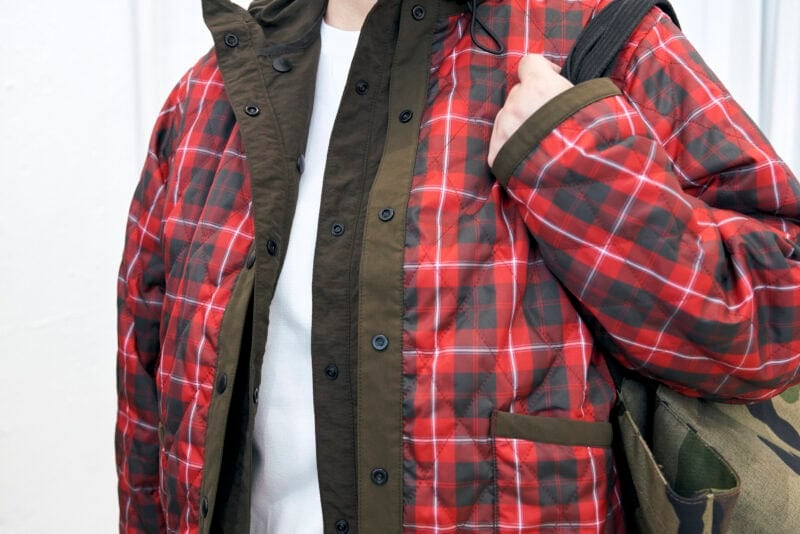 赤をベースに白と黒のチェックは、派手すぎず大人になじむカラー。「寒い夜は、フードを装着すると、より暖かく着られます」と森さん。ブラウンのA面も赤チェックのB面も、どちらも活躍度大!