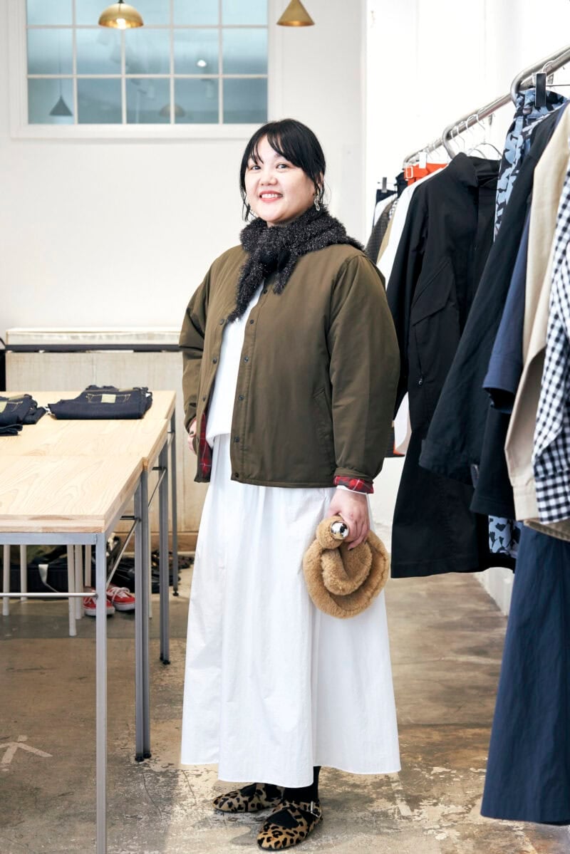 ブルゾンの中には、白のニットセーター×撥水加工の白スカートでシンプルにまとめました。「白コーデが好きで、一年中着ています。冬の白は、贅沢な気分」と森さん。ファーバッグとレオパードのバレエシューズでモード感をプラスします。「ウエストサイドがゴムになっていますが、広がりすぎないシルエットできれいに着られます」(森さん)。袖口を折り返して、チェックを見せると抜け感が出ます。
