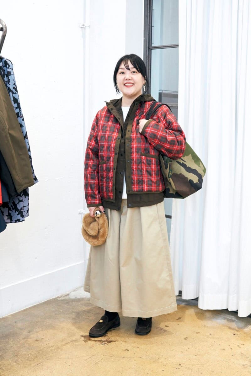 赤をベースに白と黒のチェックは、派手すぎず大人になじむカラー。「寒い夜は、フードを装着すると、より暖かく着られます」と森さん。ブラウンのA面も赤チェックのB面も、どちらも活躍度大!