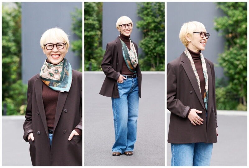 「私がスカーフを使うときは、カジュアルな服装にも合わせやすい、ユニセックスでラフな巻き方をします。特に大柄のスカーフは見せる場所によって印象も変わる便利なアイテム。ビジネスシーンでも、ふだん着をちょっとおしゃれにしたいときでも使えるので便利ですよ」