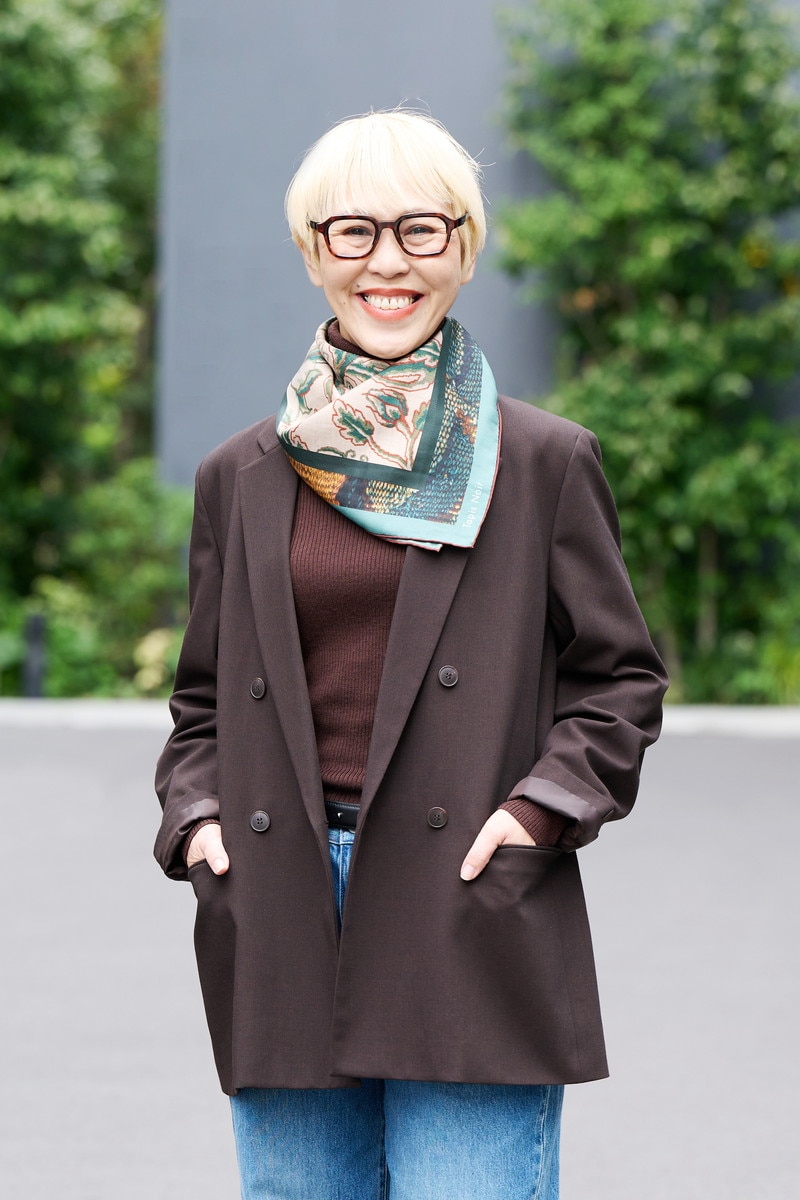 「私がスカーフを使うときは、カジュアルな服装にも合わせやすい、ユニセックスでラフな巻き方をします。特に大柄のスカーフは見せる場所によって印象も変わる便利なアイテム。ビジネスシーンでも、ふだん着をちょっとおしゃれにしたいときでも使えるので便利ですよ」