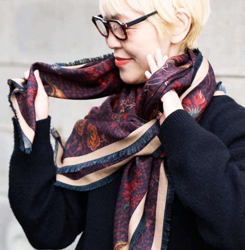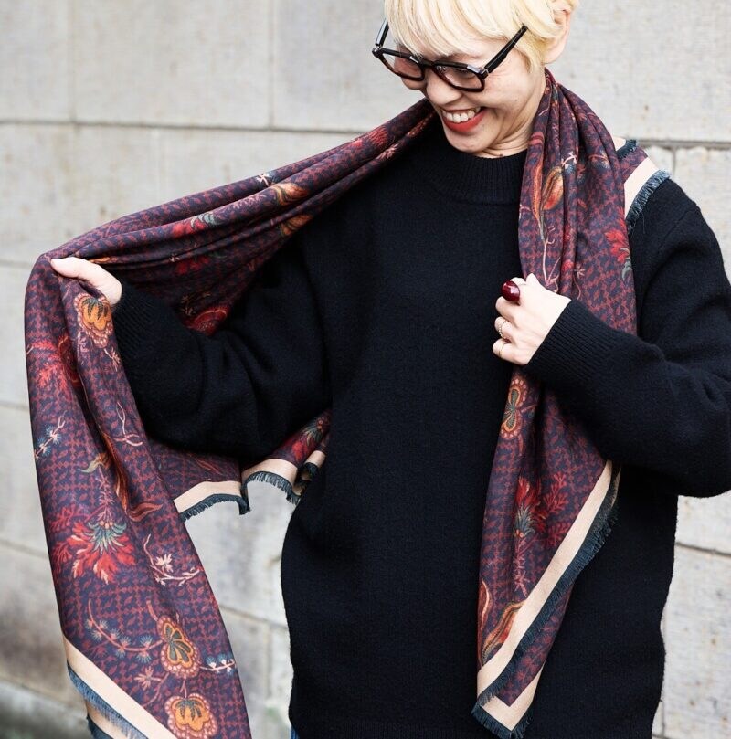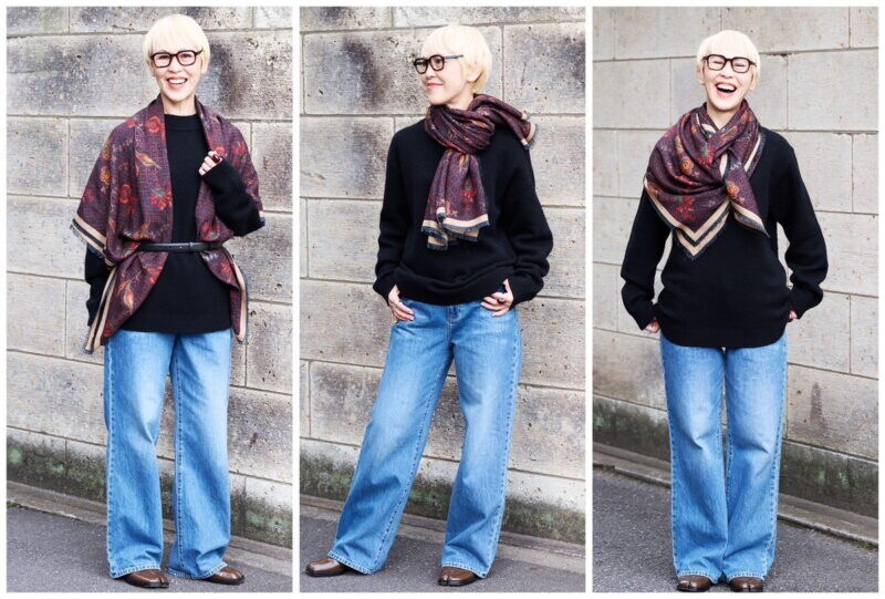 「柄物の服に柄のストール……というコーデもたまに見かけるけれど、ガチャガチャしててせっかくのストールが全然映えません。ストールが柄なら服は無地、服が柄ならストールは無地が◎。今日は黒ニットとデニムのコーデにしました。ストールはスカーフと違ってボリュームがあるので、ぐるぐる首に巻くだけでもサマにはなりますが、巻き方をいくつか知っておくと、イメージチェンジがしやすいです」