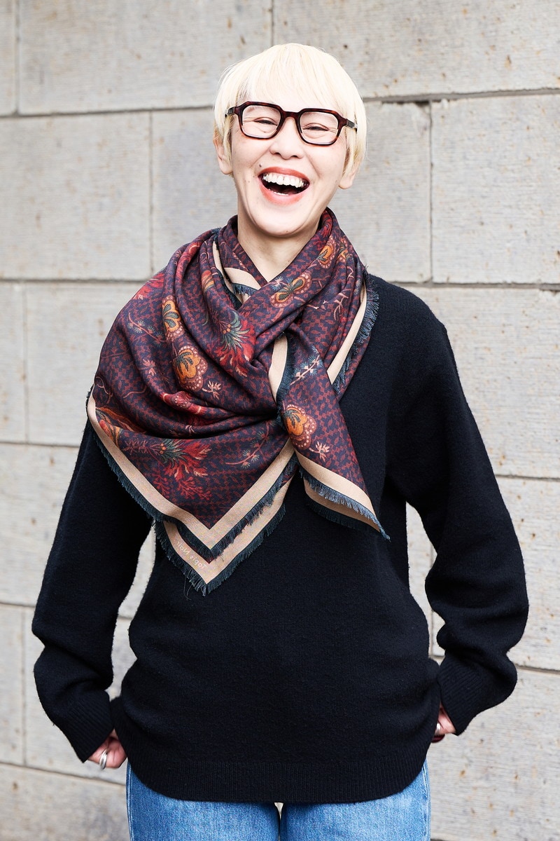 「複雑に見えますが、実は結び目を作らずにラフにまとめただけ。ストールの柄もよく見えるし、立体的でいいでしょ?」