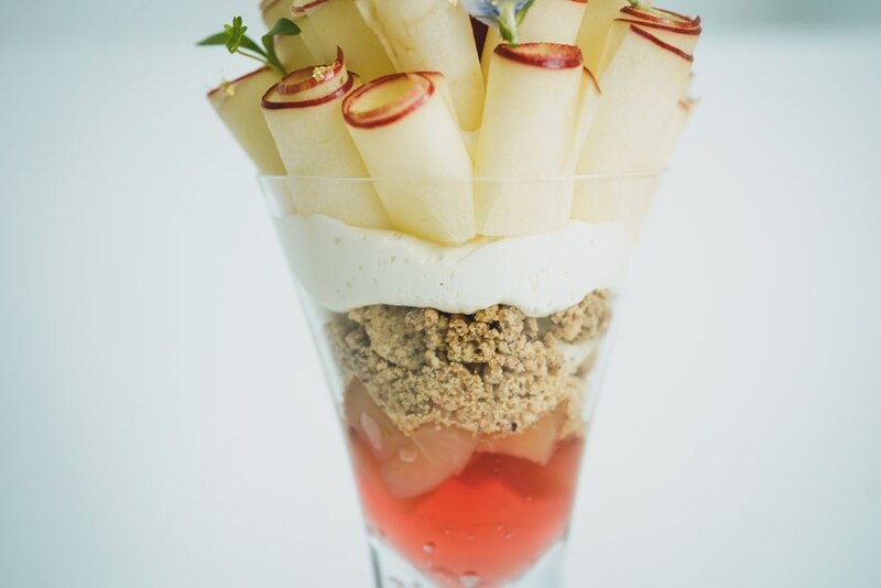 渕上シェフ「中の構成はアイスとソルベを一種ずつ入れ、間のクリームやクランブルとの温度差をつけて、途中で食べ飽きないようにしています。また糖分と脂肪分を抑えて重たい印象は避けることも大事にしています。甘みだけではなく、食材の輪郭をつける為の塩分も必要。その時、香りと旨みを引き出すための糖分のバランスを取ることも大事です。
