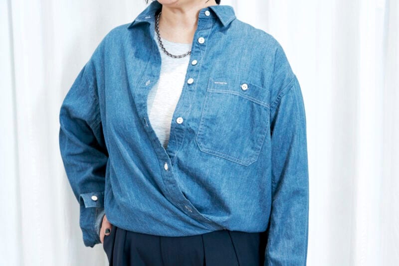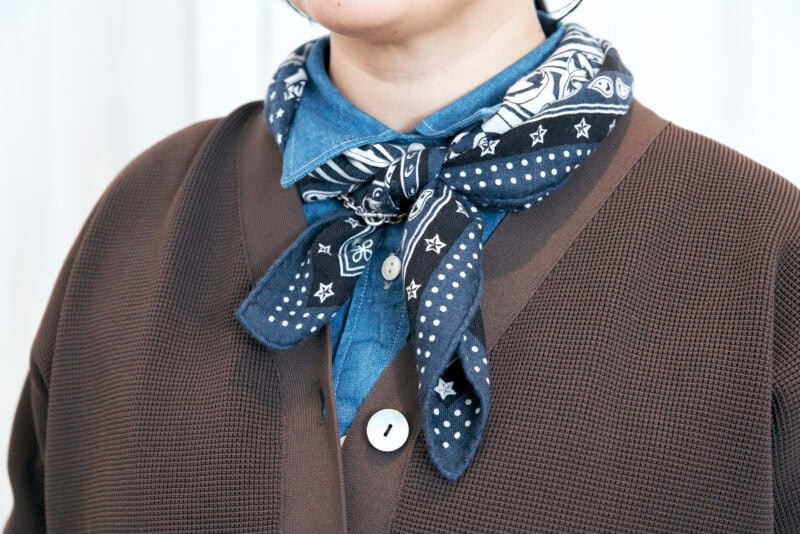 ショップでお客さまに対応する日曜日は、麻が少し入ったワークデニムシャツにスーパーワイドパンツを合わせました。「カーディガンの丈が短めで、裾からデニムシャツを見せると、抜け感が出ます」と森さん。ボリューミーなワイドパンツはポリエステル生地なので、シワになりにくく、軽やかな印象に。首元のスカーフがスタイリングをピリッと引き締めます。