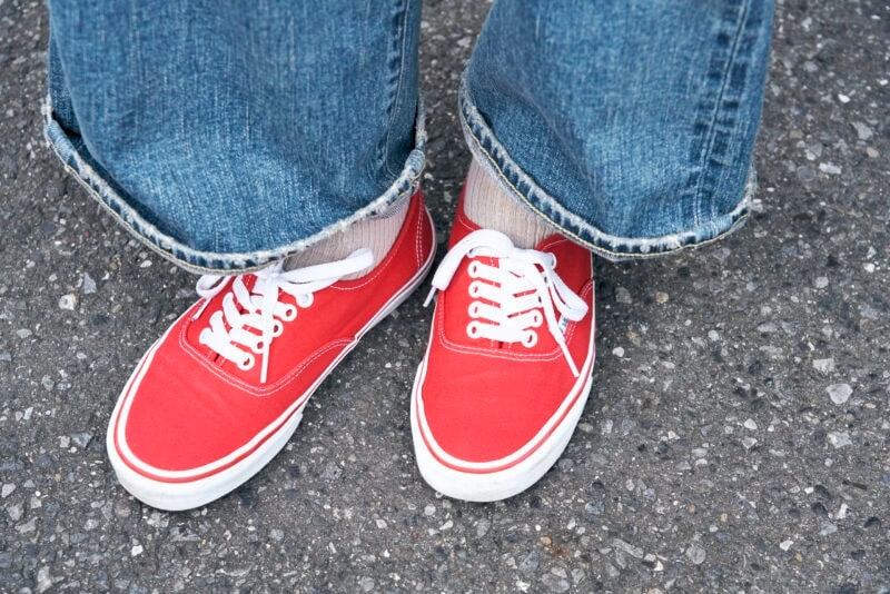 スニーカーはヴァンズ(写真)かコンバースを愛用。「差し色にした赤チェックのストールとカラーリンクしました」(森さん)。