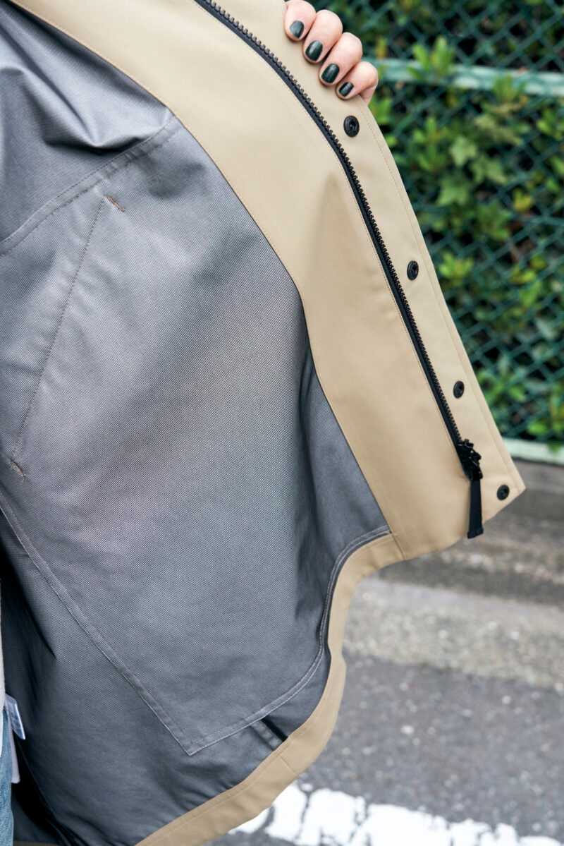 撥水加工が施されたコートは、三層構造になっていて冷気を通しません。それでいて軽くて、家庭で洗濯できるのが◎。