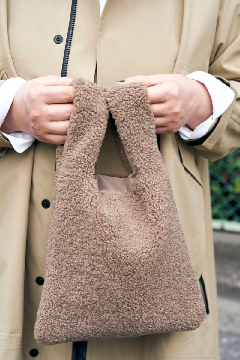 テディベアのぬいぐるみのようなボアバッグは、今シーズンの人気者。「持ち手を交差させると表情が出て可愛く、中の荷物も見えません」と森さん。