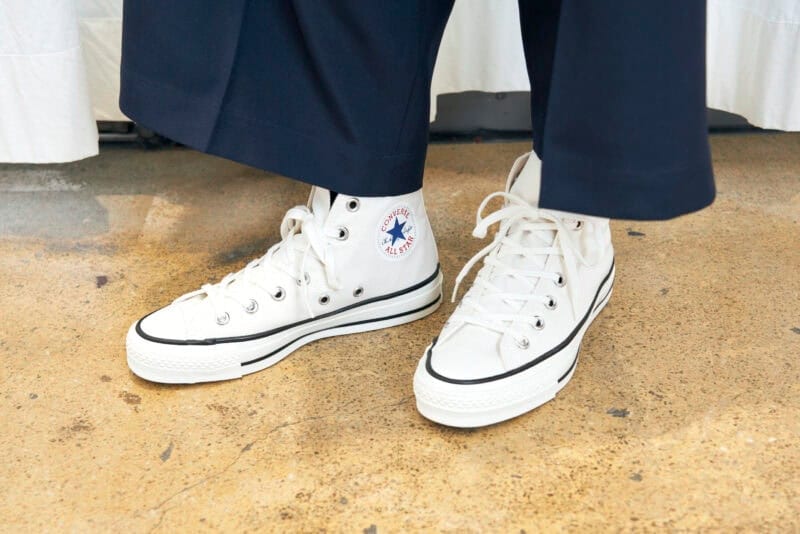 「コンバースは基本的にハイカットが好きです。白がマイ定番」と森さん。秋冬のパンツコーデにシンプルな白スニーカーを合わせると、こなれ感が増します。