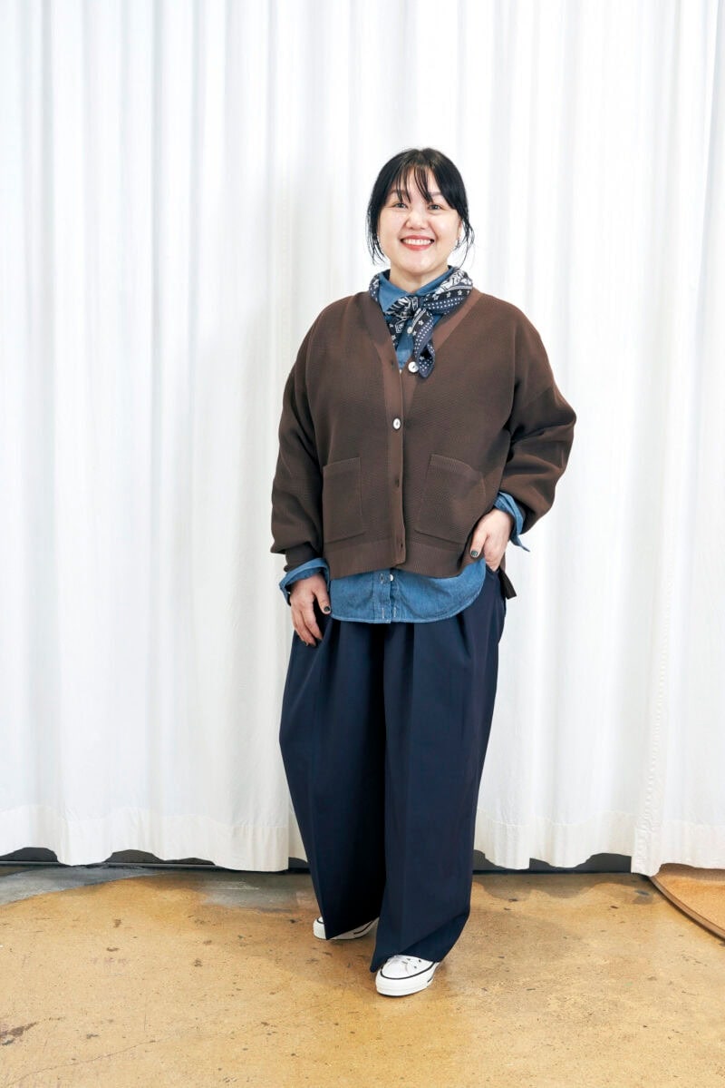 ショップでお客さまに対応する日曜日は、麻が少し入ったワークデニムシャツにスーパーワイドパンツを合わせました。「カーディガンの丈が短めで、裾からデニムシャツを見せると、抜け感が出ます」と森さん。ボリューミーなワイドパンツはポリエステル生地なので、シワになりにくく、軽やかな印象に。首元のスカーフがスタイリングをピリッと引き締めます。