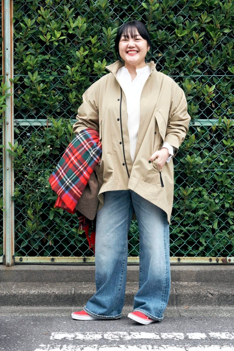 「仕事が休みの土曜日は、お気に入りのカフェでまったりと過ごします。そんな日は、ヴィンテージデニムにフレアシャツとカーディガンを重ね着します。外は寒いので、防水防風加工をしたコートをはおります」と森さん。このデニムはボタンフライでシルエットはバギー。稀少な「赤耳」デニムをリユースしたもので、「SDGsにのっとり、水を使わずに最先端のレーザー加工を施しています」(森さん)。赤のタータンチェックの大判ストールを差し色にしました。