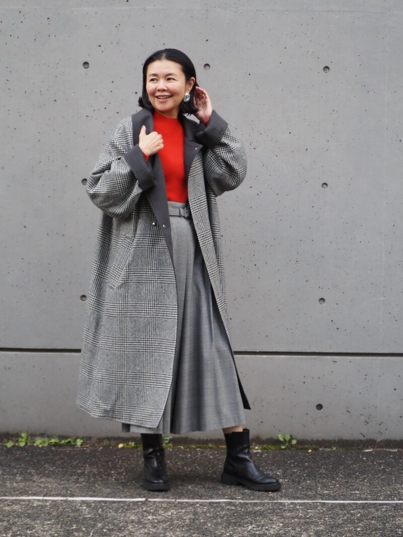 チェック柄のロングコートに鮮やかな赤ニットが映える冬の装い。落ち着きのあるグレーを基調としながらも、顔まわりにカラーアイテムを添えることで、顔まわりのトーンがアップします。身幅にゆとりのあるアウターを選ぶと、体型を拾わずこなれ感が出せるのだとか。