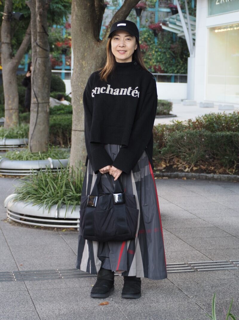黒のニットとロング丈のチェック柄スカートで品よくまとめたモノトーンスタイル。「落ち着いた配色の中で映えるスカートをポイントに、コーディネートを考えました」。キャップやブーツなど、カジュアルな要素をほどよく取り入れることで、気負わない大人の冬コーデが完成。