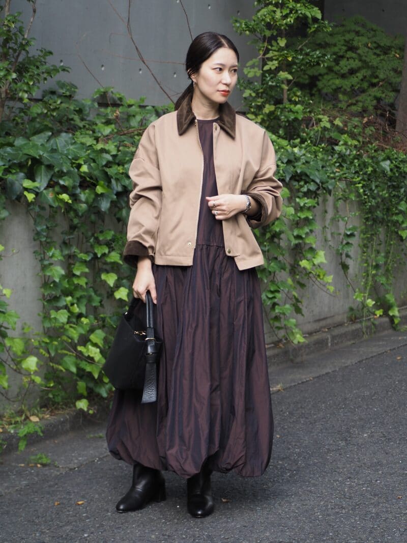 適度に光沢のある「ティアラ」のバルーンワンピースは、お呼ばれや食事会などにもマッチ。スカートのボリューム感と歩くたびにふんわり揺れる動きのあるデザインが魅力です。ドラマティックな主役級アイテムも、あえてラフなブルゾンを合わせることで、日常になじむ装いに。