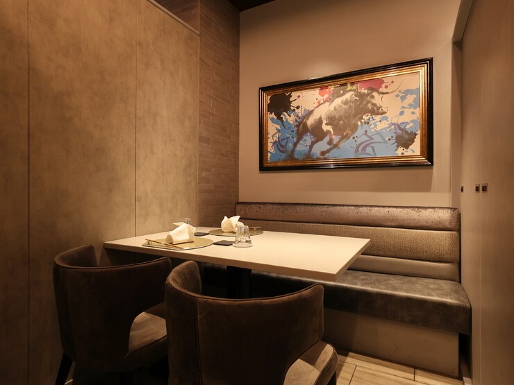 店内は、ミシュラン店も手がけたデザイナーが監修する和モダン空間。躍動感あふれる牛が描かれたアートが目を引きます。カウンター席やテーブル席のほか、最大8名まで利用できる完全個室を用意。記念日デートや接待、会食など、さまざまなシーンにふさわしい上質な空間になっています。