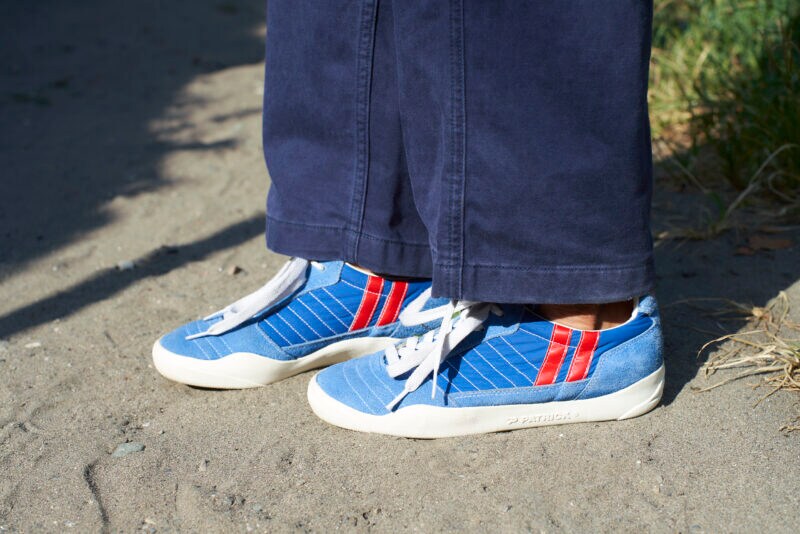 「スニーカーはパトリックが好きで、いくつかのタイプを愛用しています。ブルーコーデに、赤ラインが効いた明るいブルーを足元に選びました」と山根さん。きれいめパンツコーデに抜け感をプラス。