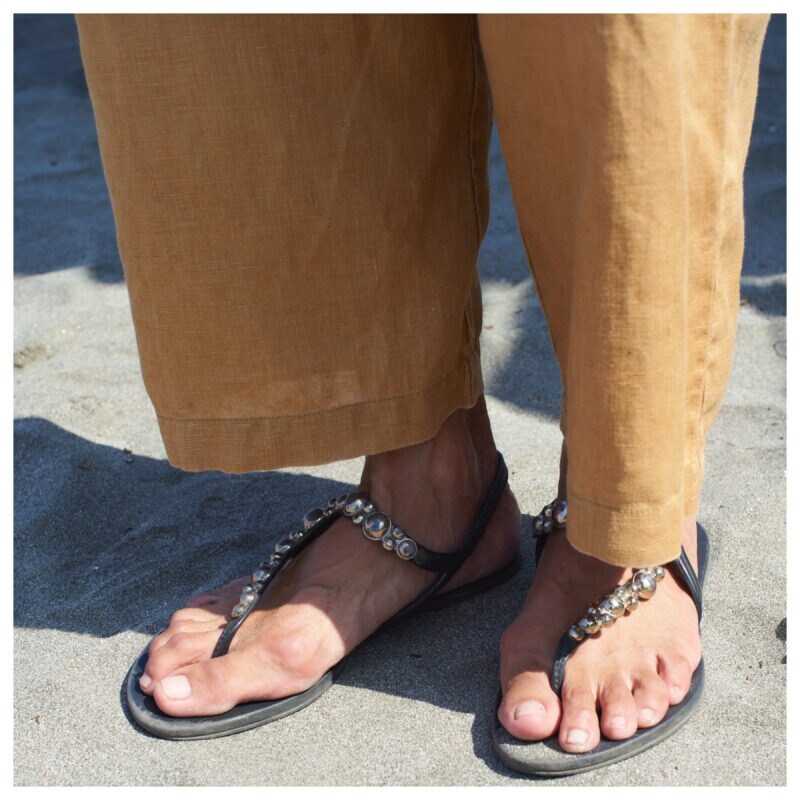 海辺の町では、ゴールデンウィークから10月半ばまではビーチサンダルが主流です。「スタンダードなビーサンよりちょっとおしゃれな気分になれるのが、このビジュー付きのトングサンダル。ハワイで手に入れたサロペットパンツにぴったりです」(山根さん)