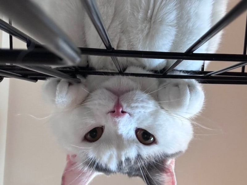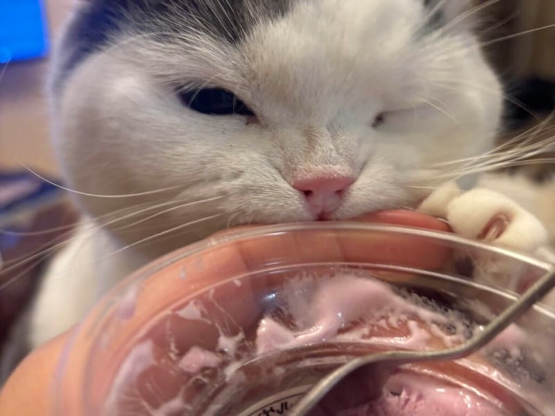 このとおり、ぼくは食いしん坊で、甘えん坊、運動もイタズラもダイスキ!! 毎日ドタバタ楽しく過ごしているよ。これは、かあちゃんが美味しそうにしてたから近づいてみたけど、ダメって言われちゃったところ。
