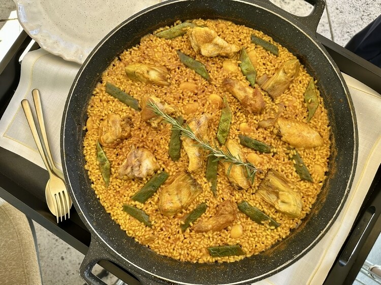 着いた日のランチは、天気もいいので白亜の建物の庭にあるレストラン【エル・ハルディン・デル・リッツ】で取りました。シャンパーニュでパエリアをいただきます。パエリアはダコスタ氏の故郷バレンシア地方が発祥とされている料理です。日本でも人気ですね。